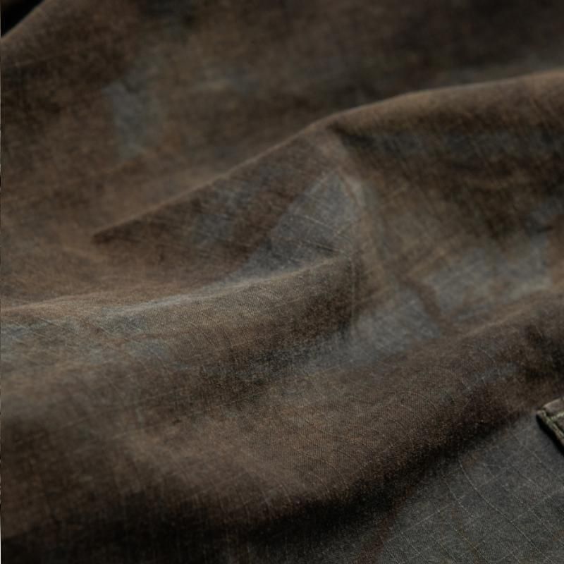 硫化染料による製品染め後、全く水を使用しない特殊なブリーチ加工を施しております。