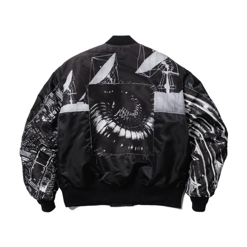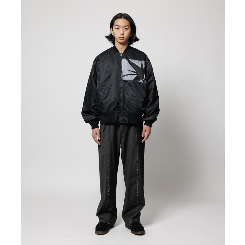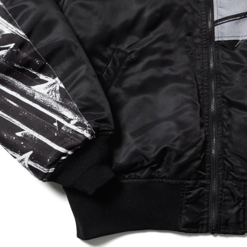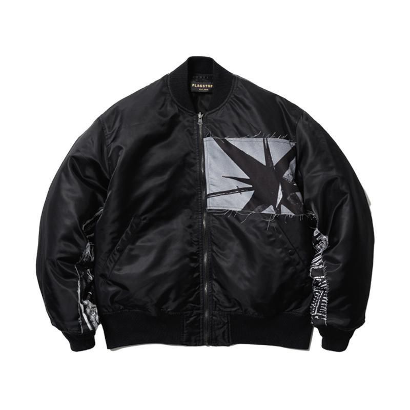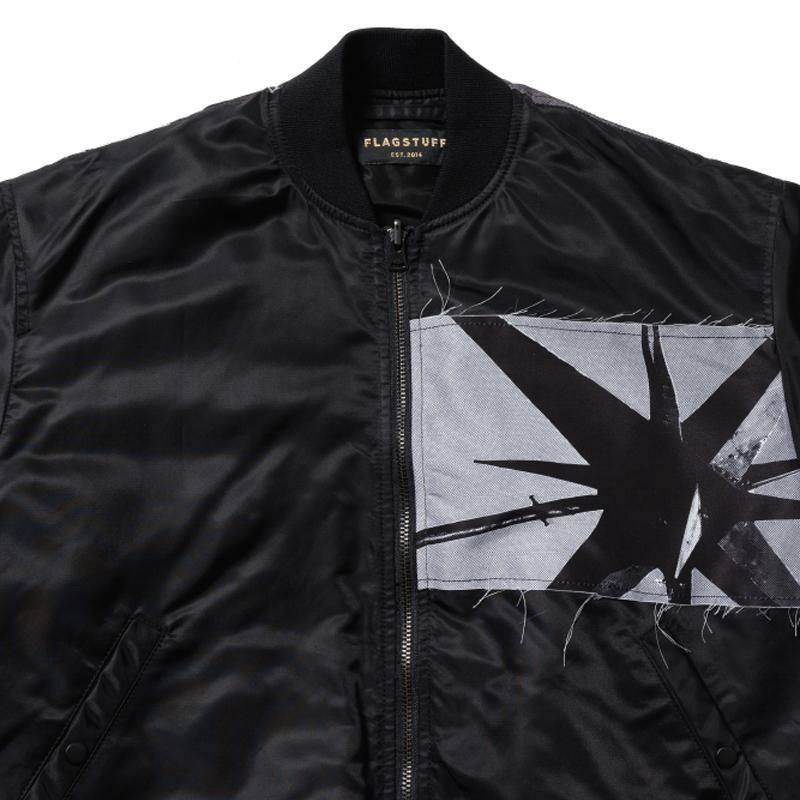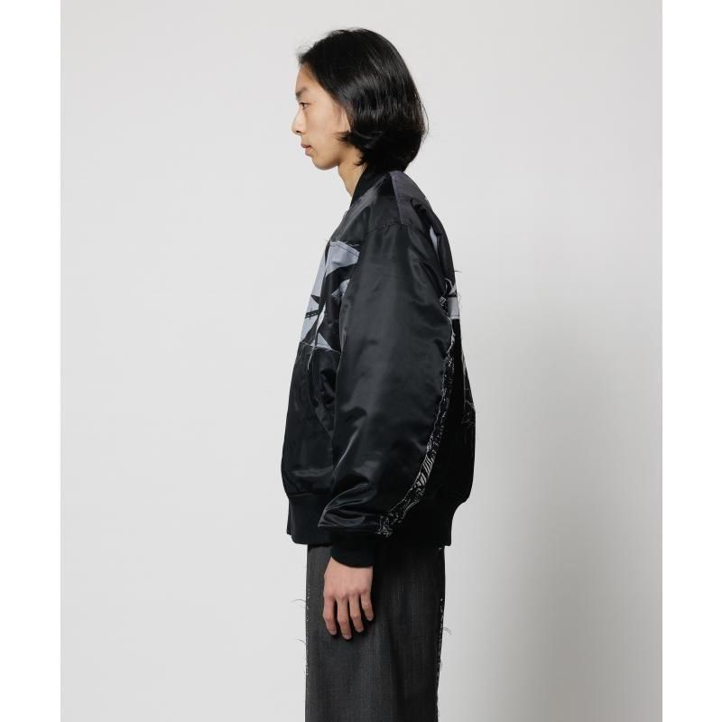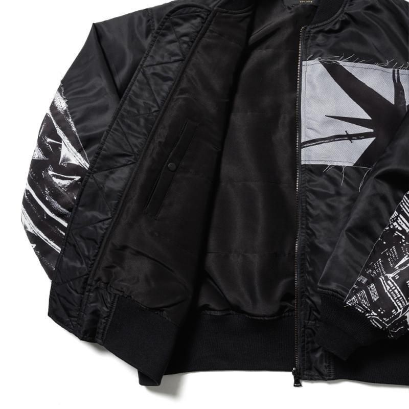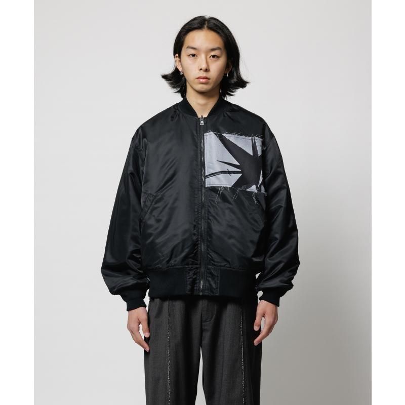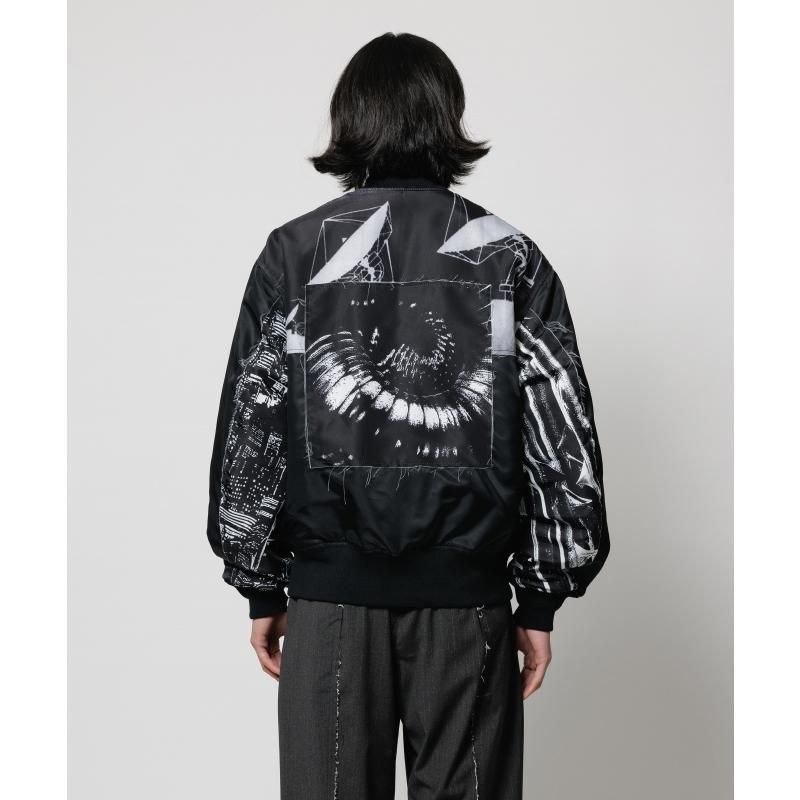 ・前身、後ろ身、袖にプリント生地を貼り付け、さらに手作業でカットオフ仕様にしたMA-1。