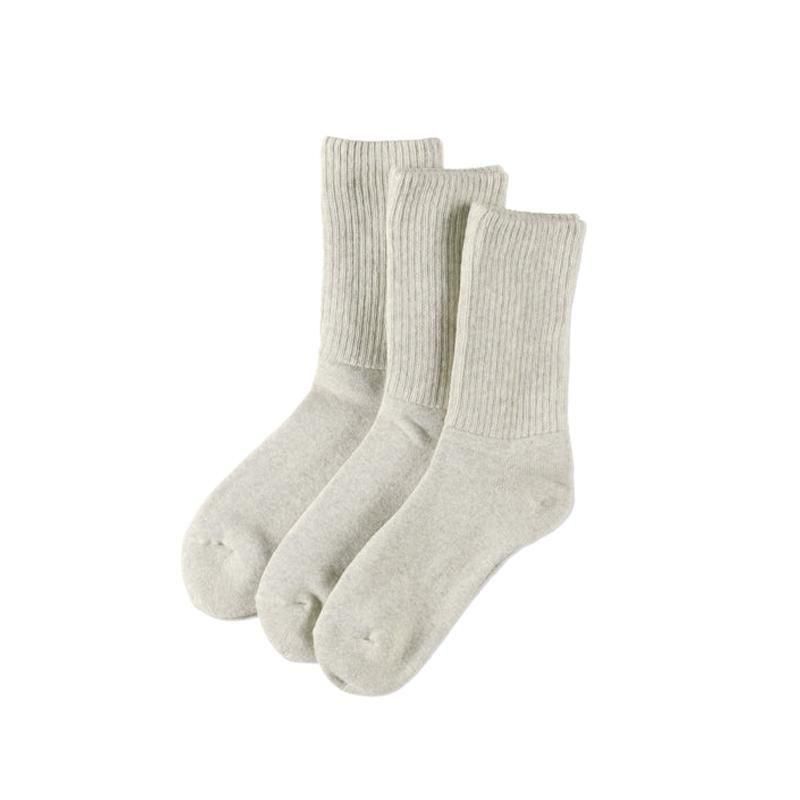 履き口の横伸びが大きく、ルーズ感が出るように編み立てられ、足底部分はフルパイル編みで、ふんわりとした履き心地のソックスです。