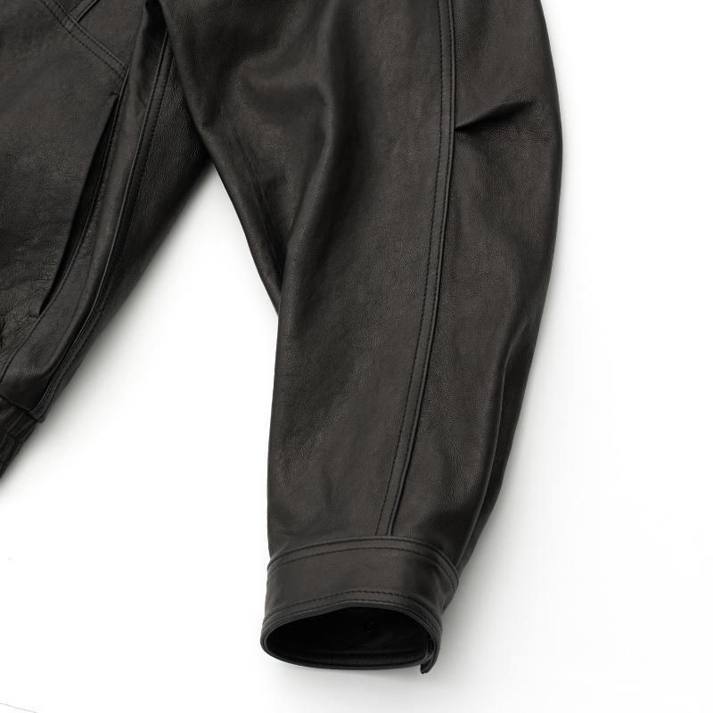 様々なカットと肘のカーブなど、革製品では表現が難しいディテールとデザインを一枚の革ジャケットで構成されたLambskin Utility Blousonです。